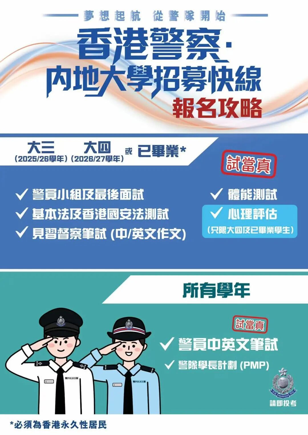 ➤大三及大四即将毕业并于当地就读的香港学生,以及已经大学毕业之香港永久性居民均可进行警员小组面试/最后面试、督察笔试、体能测试、心理评估(只限于2026/27学年内毕业的学生)、基本法及香港国安法测试。